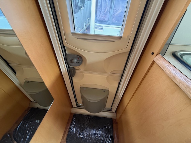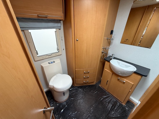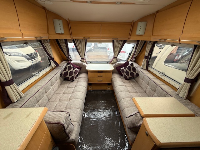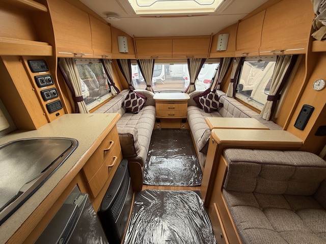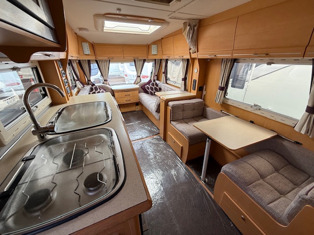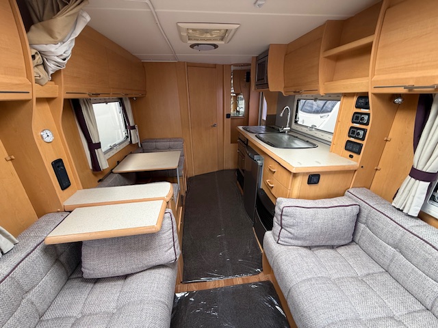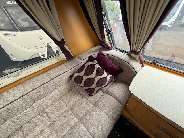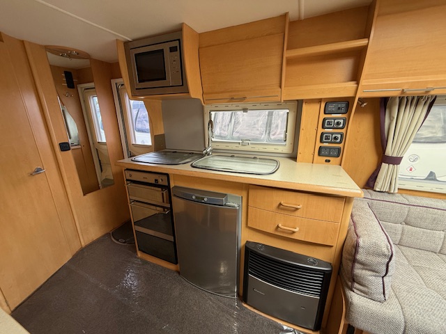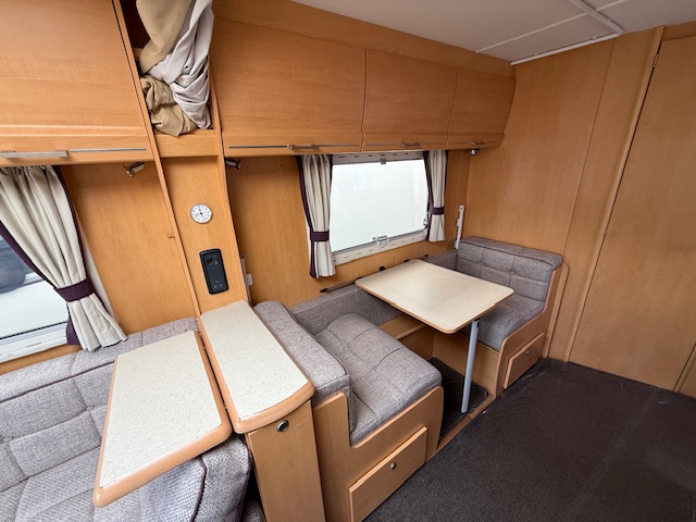 This 4 berth touring caravan has a seating area at the front. The slats pull out from underneath the front chest enabling you to make the front bed or the seats are long enough to make into two singles. Behind the sitting area is the kitchen which is well equipped with 3 way fridge with freezer compartment, gas hob, gas oven & grill, microwave and lots of storage. Opposite the kitchen area is the dinette which converts into bunk beds with storage lockers above. To the rear of the caravan is the washroom with Thetford swivel toilet, vanity unit and separate shower.