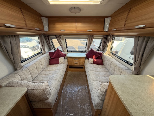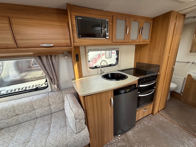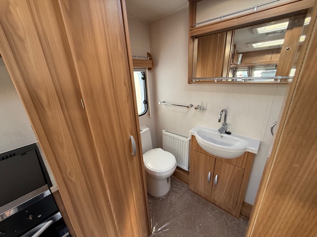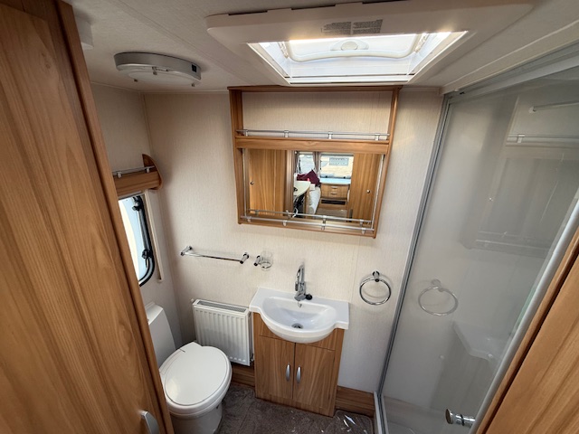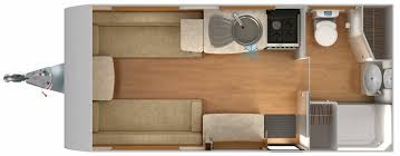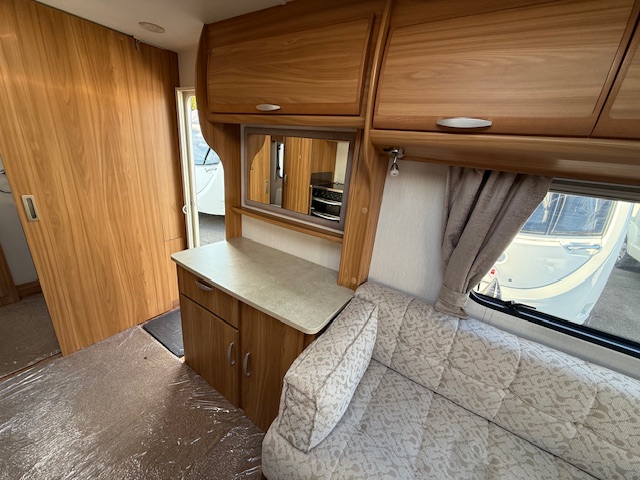 This 2 berth touring caravan has a seating area at the front. The slats pull out from underneath the front chest enabling you to make the front bed or the seats are long enough to make into two singles. Behind the sitting area is the kitchen which is well equipped with 3 way fridge, dual fuel hob, gas oven & grill, microwave and lots of storage. To the rear of the caravan is the washroom area which has an electric flush toilet, separate shower unit, washroom sink and vanity cupboards.