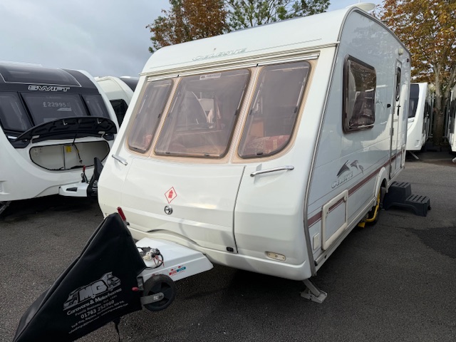 This 2 berth touring caravan has a seating area at the front. The slats pull out from underneath the front chest enabling you to make the front bed or the seats are long enough to make into two singles. Behind the sitting area is the kitchen which is well equipped with 3 way fridge, dual fuel hob, gas oven & grill, microwave and lots of storage. To the rear of the caravan is the washroom area which has a Thetford swivel electric flush toilet, separate shower unit, washroom sink and vanity cupboards.