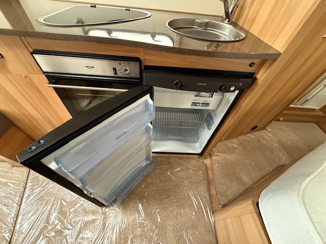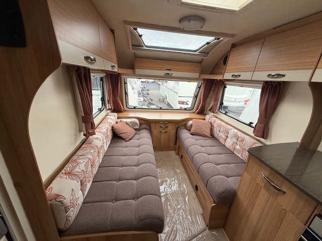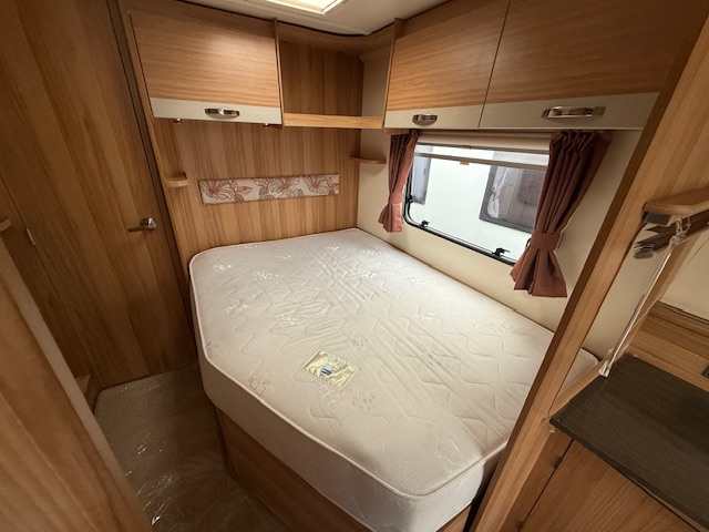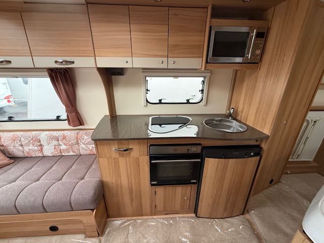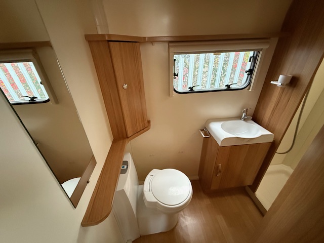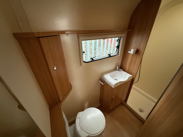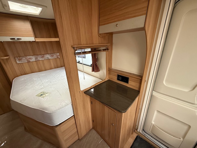 This 4 berth touring caravan has a seating area at the front. The slats pull out from underneath the front chest enabling you to make the front bed or the seats are long enough to make into two singles. Behind the sitting area is the kitchen which is well equipped with 3 way fridge, dual fuel hob, gas oven & grill, microwave and lots of storage. With Welsh dresser opposite with storage and TV Points. To the centre of the caravan is the French bed with storage above and below, also a wardrobe opposite. To the rear of the caravan is the washroom area which has a Thetford swivel electric flush toilet, separate shower unit, washroom sink and vanity cupboards.