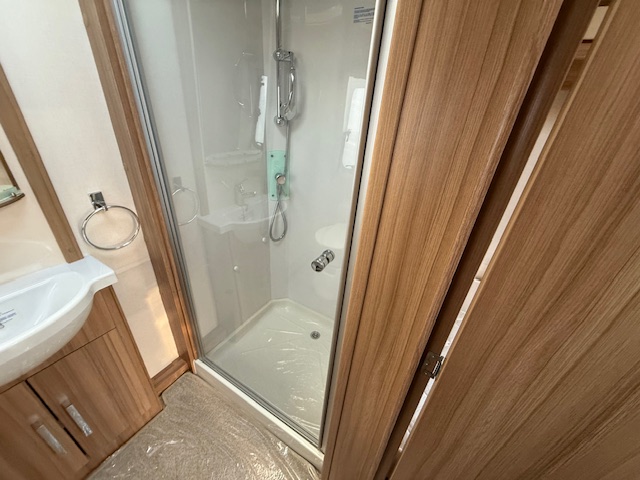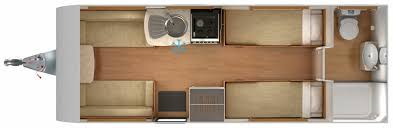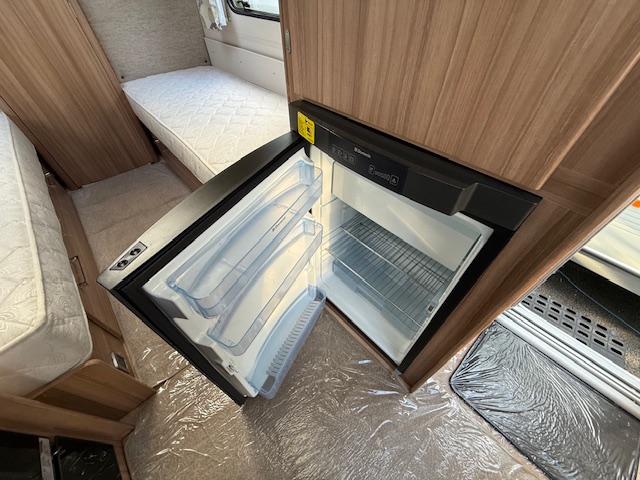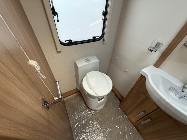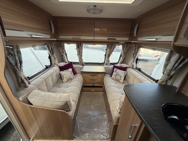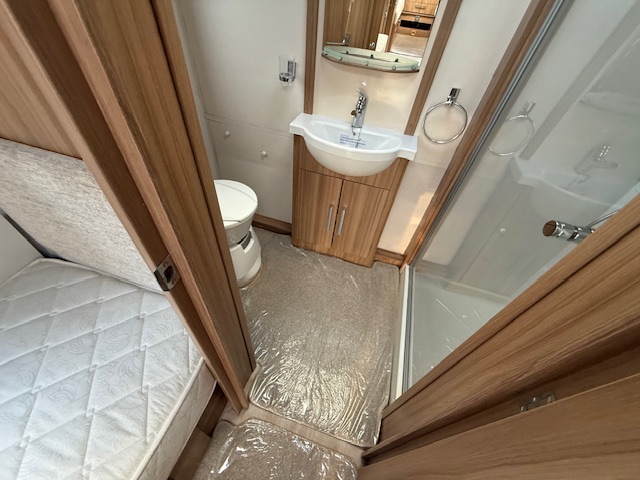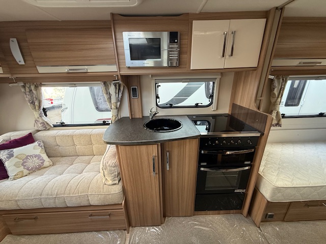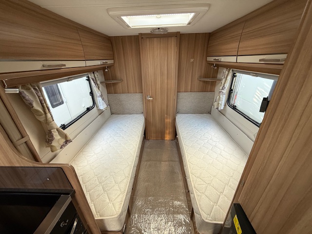 This 2 berth touring caravan has a seating area at the front. The slats pull out from underneath the front chest enabling you to make the front bed or the seats are long enough to make into two singles. Behind the sitting area is the kitchen which is well equipped with 3 way fridge, dual fuel hob, gas oven & grill, microwave and lots of storage. In the middle of the caravan is two single beds which have storage beneath. To the rear of the caravan is the washroom area which has an electric flush toilet, separate shower unit, washroom sink and vanity cupboards.