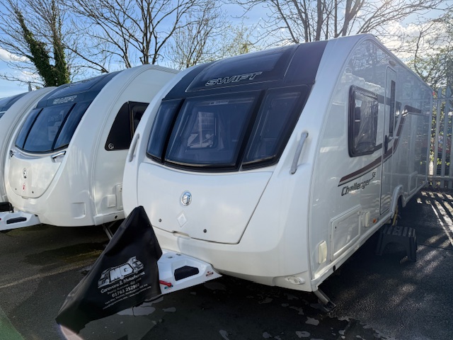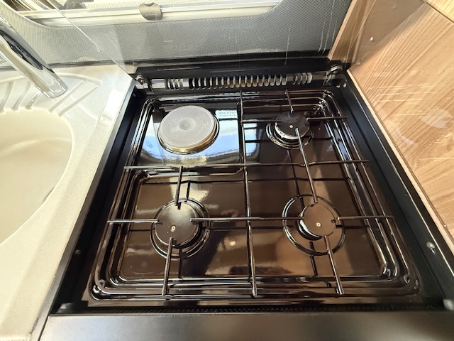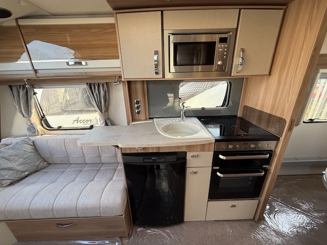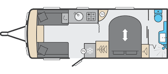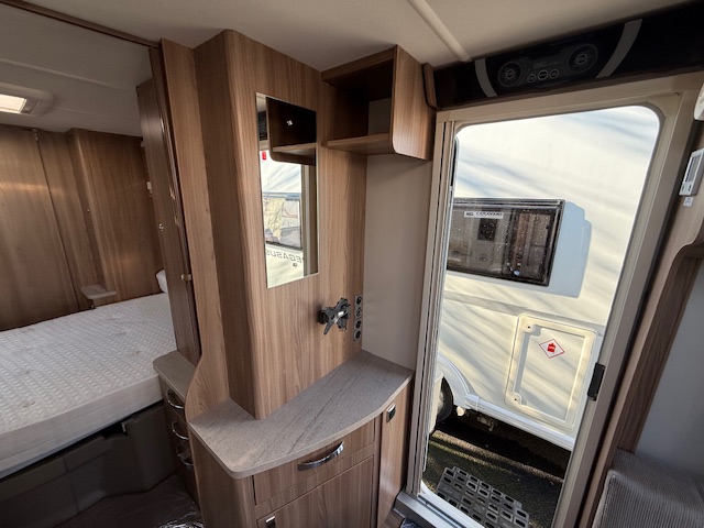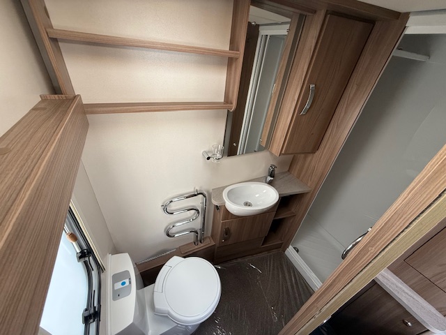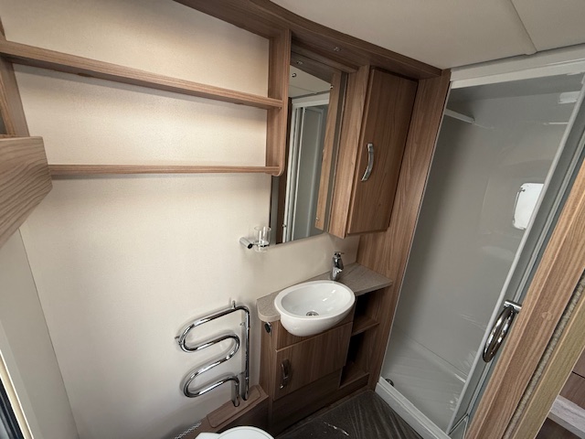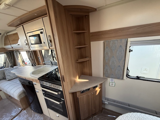 This 4 berth touring caravan has a seating area at the front. The slats pull out from underneath the front bench enabling you to make the front bed to a double. Behind the sitting area is the kitchen which is well equipped with 3 way fridge, gas hob, gas oven & grill, microwave and lots of storage. To the centre of the caravan island bed, with storage underneath and wardrobes either side with lockers above. To the rear of the caravan is the washroom area which has a Thetford swivel electric flush toilet, separate shower unit, washroom sink and vanity cupboards.