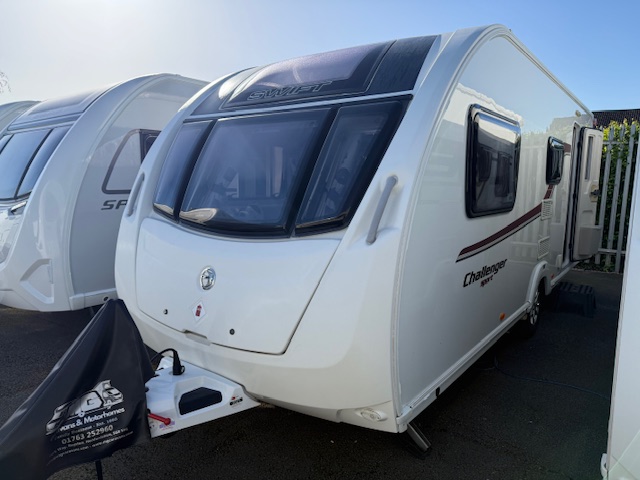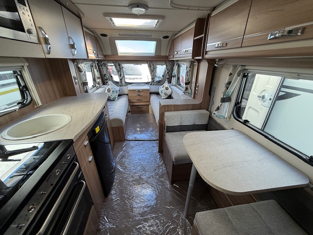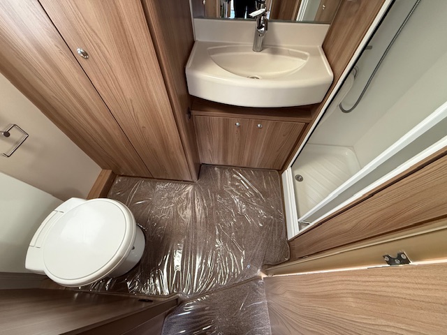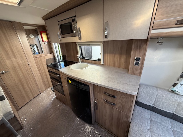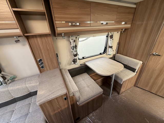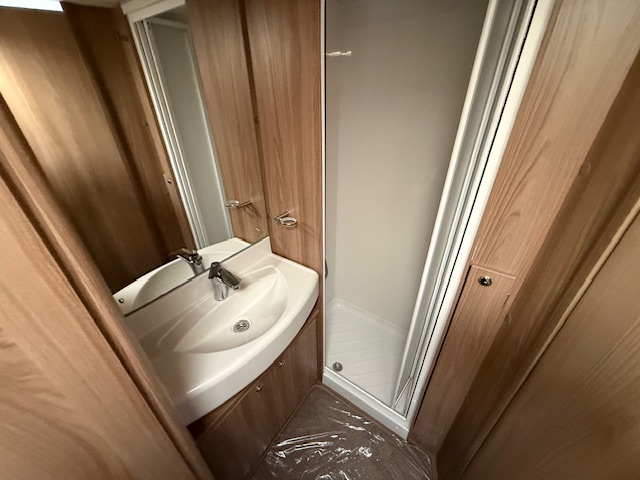 This 4 berth touring caravan has a seating area at the front. The slats pull out from underneath the front bench enabling you to make the front bed to a double. Behind the sitting area is the kitchen which is well equipped with 3 way fridge, gas hob, gas oven & grill, microwave and lots of storage. Opposite the kitchen is the dinette area which converts into bunk beds, there are also storage lockers above. To the rear of the caravan is the washroom area which has a Thetford swivel electric flush toilet, separate shower unit, washroom sink and vanity cupboards.