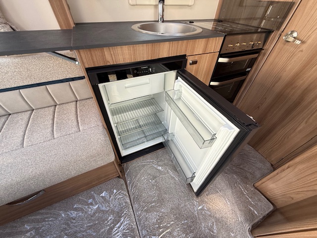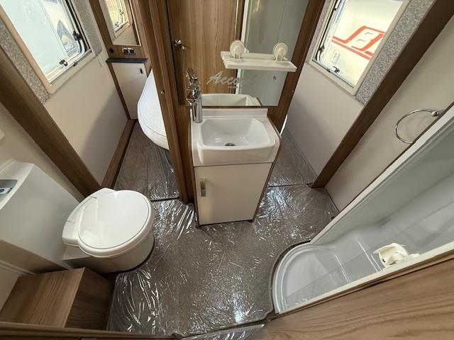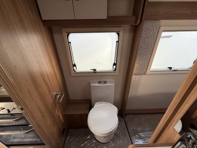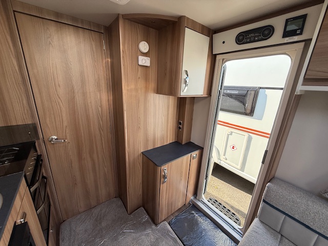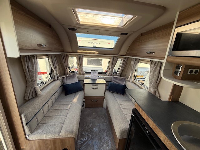 Other features include Truma Combi heating, radio with speakers, loose fit carpets with wipe clean flooring beneath, one-piece door with flyscreen and bin, flyscreens and blinds to all windows and rooflights, digital TV aerial.