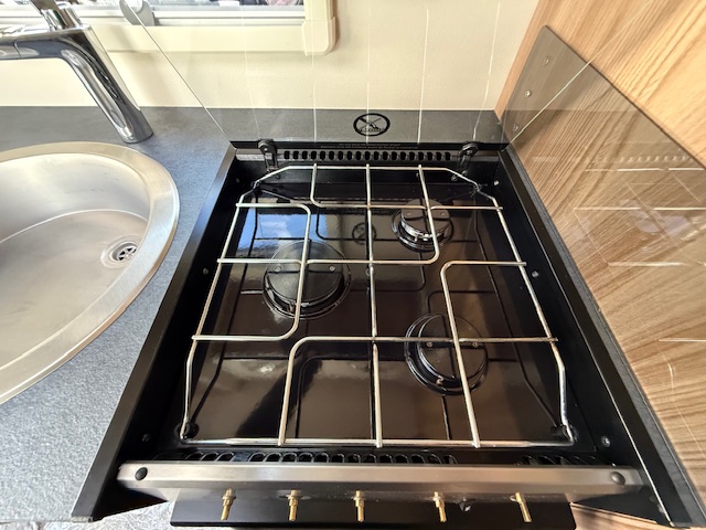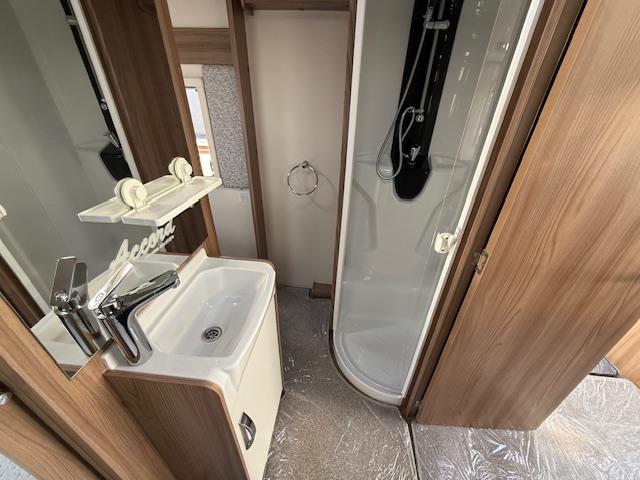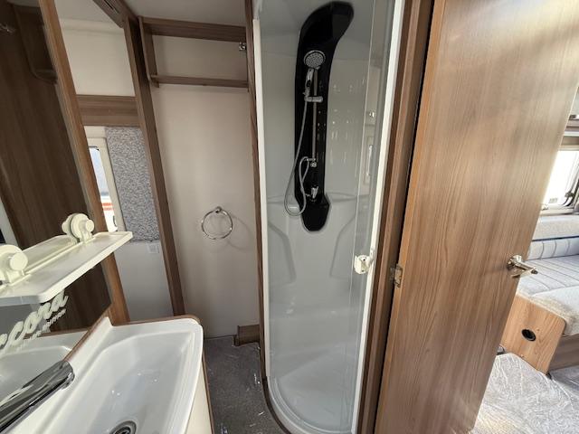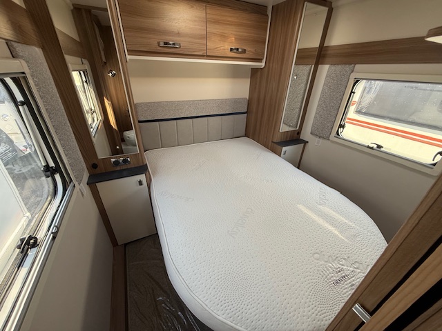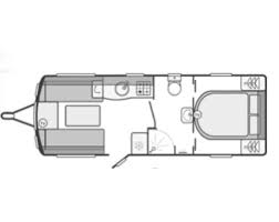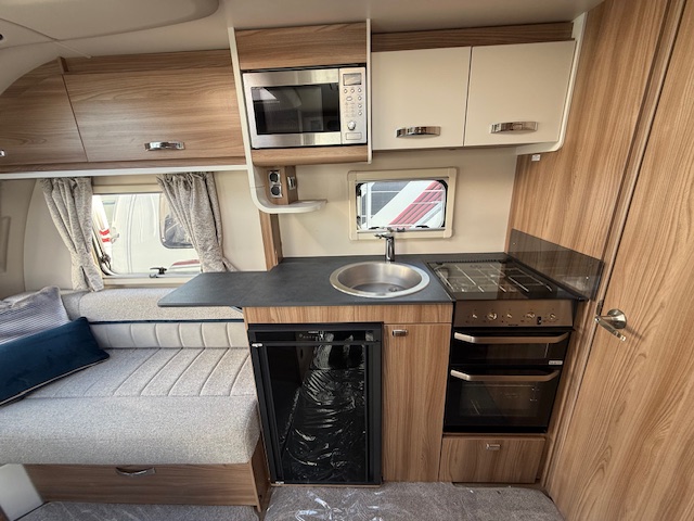 This 4 berth touring caravan has a seating area at the front. The slats pull out from underneath the front chest enabling you to make the front bed or the seats are long enough to make into two singles. Behind the sitting area is the kitchen which is well equipped with 3 way fridge, gas hob, gas oven & grill, microwave and lots of storage. To the centre of the caravan is the washroom area which has a Thetford swivel electric flush toilet, separate shower unit, washroom sink and vanity cupboards. To the rear is the fixed island bed with wardrobes either side.