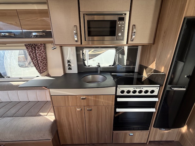 This 2 berth touring caravan has a seating area at the front. The slats pull out from underneath the front chest enabling you to make the front bed or the seats are long enough to make into two singles. Behind the sitting area is the kitchen which is well equipped with 3 way fridge, dual fuel hob, gas oven & grill, microwave and lots of storage. To the rear of the caravan is the washroom area which has a Thetford swivel electric flush toilet, separate shower unit, washroom sink and vanity cupboards.