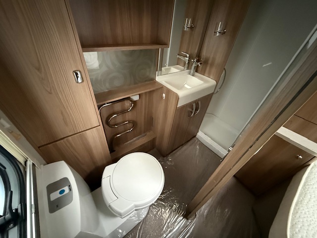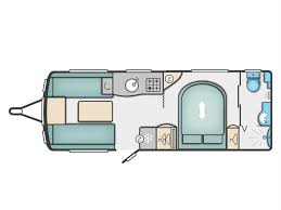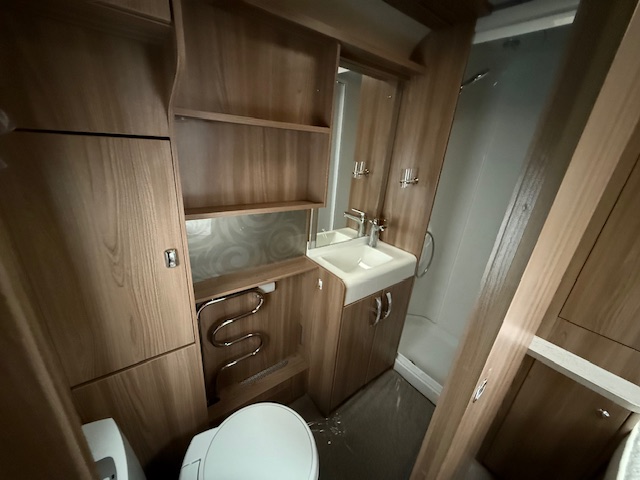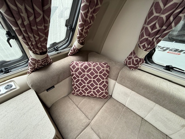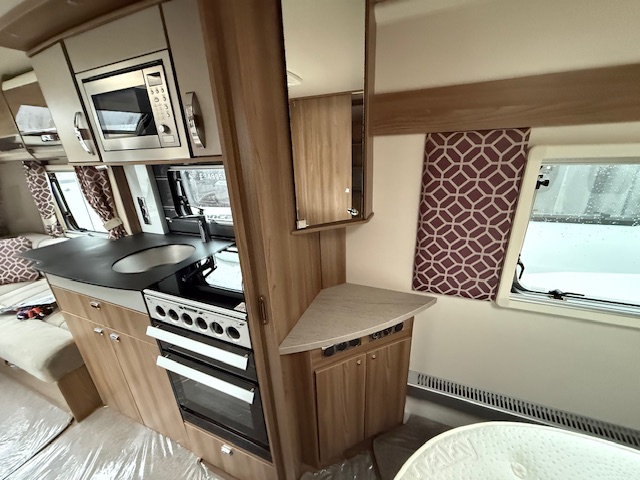 This 4 berth touring caravan has a seating area at the front. The slats pull out from underneath the front bench enabling you to make the front bed to a double. Behind the sitting area is the kitchen which is well equipped with 3 way fridge, gas hob, gas oven & grill, microwave and lots of storage. To the centre of the caravan island bed, with storage underneath and wardrobes either side with lockers above. To the rear of the caravan is the washroom area which has a Thetford swivel electric flush toilet, separate shower unit, washroom sink and vanity cupboards.