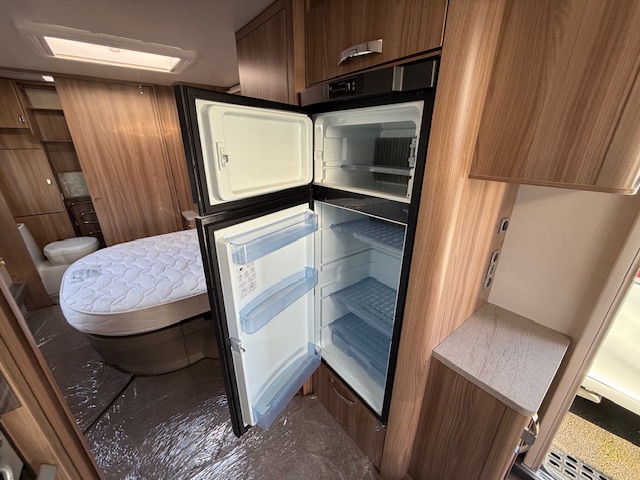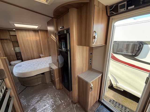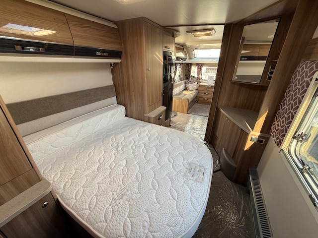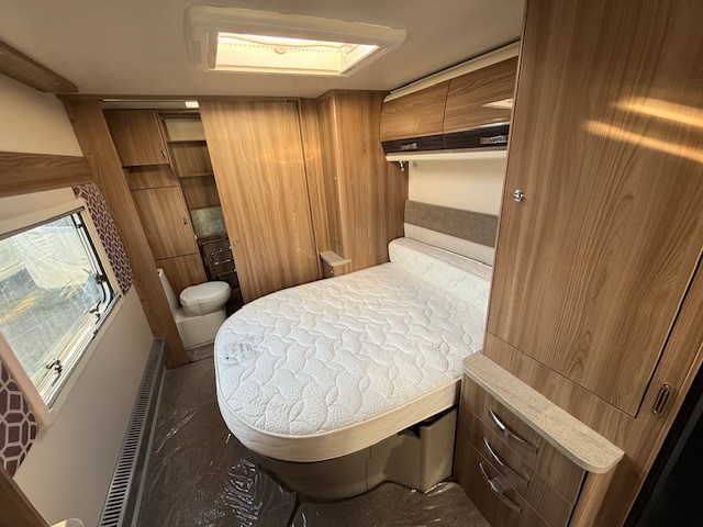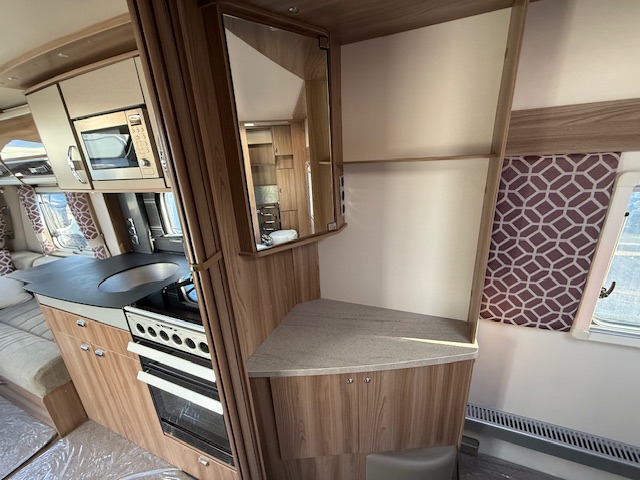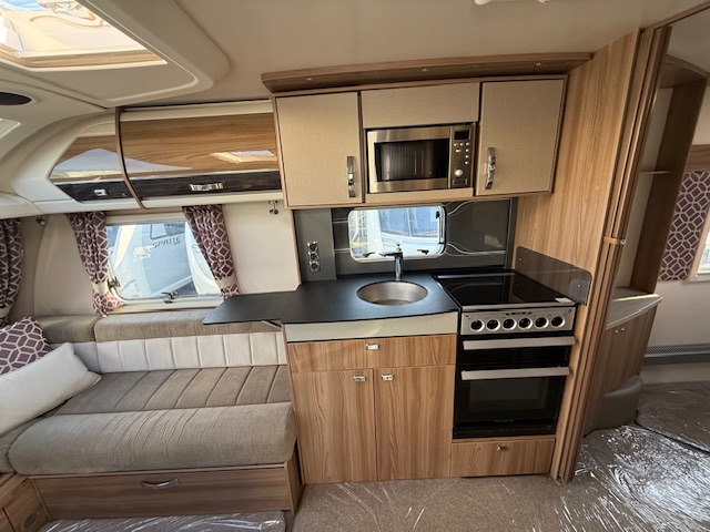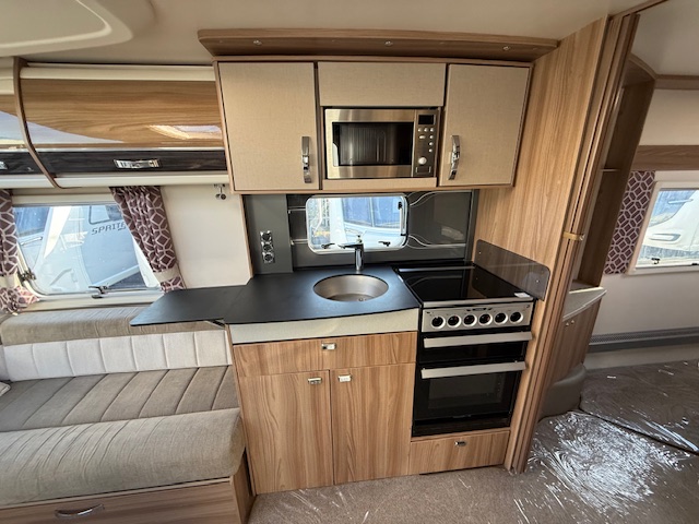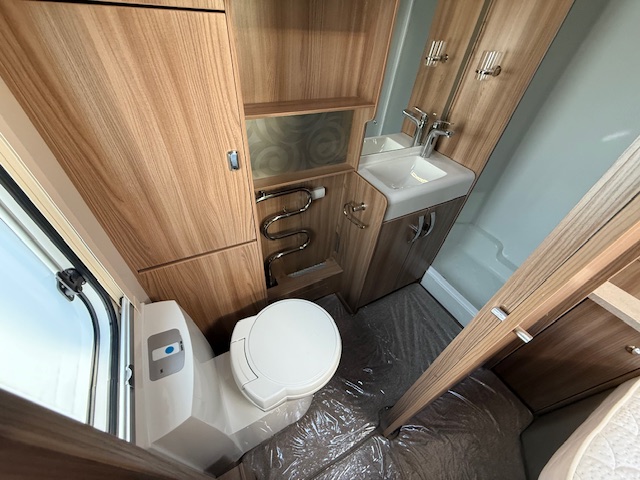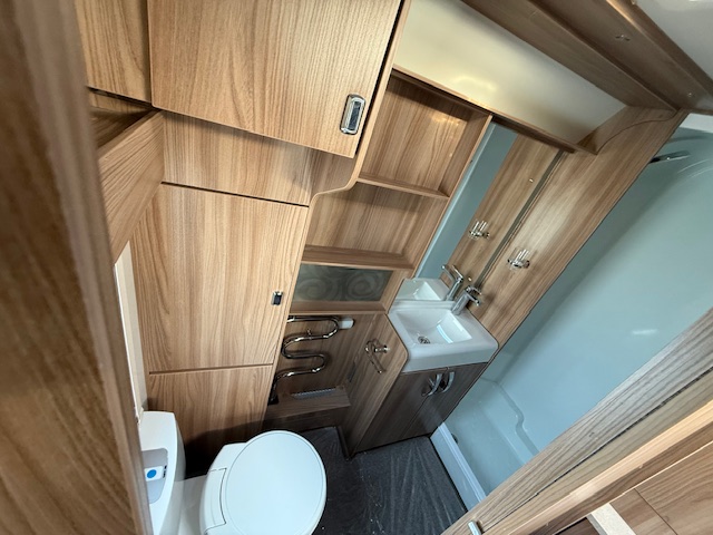This 4 berth touring caravan has a seating area at the front. The slats pull out from underneath the front chest enabling you to make the front bed or the seats are long enough to make into two singles. Behind the sitting area is the kitchen which is well equipped with 3 way fridge, dual fuel hob, gas oven & grill, microwave and lots of storage. To the centre of the caravan is the fixed transverse island bed with wardrobes either side, vanity area & storage underneath. To the rear is the washroom area which has a Thetford swivel electric flush toilet, separate shower unit, washroom sink and vanity cupboards.