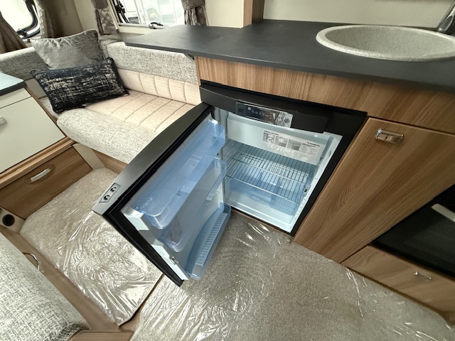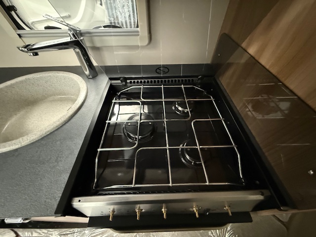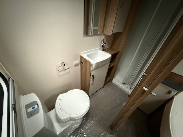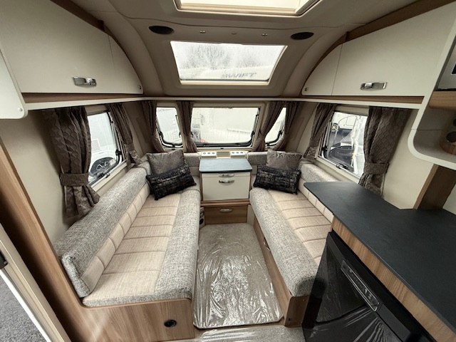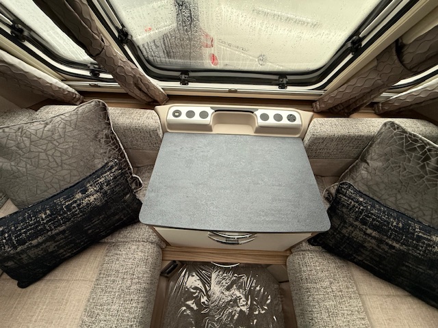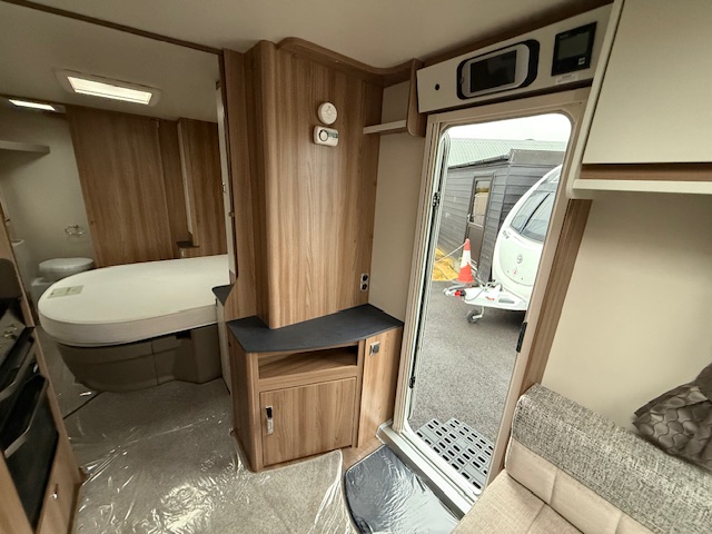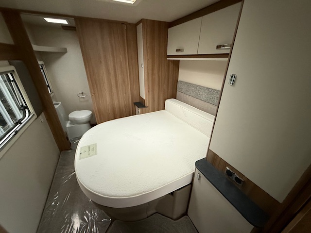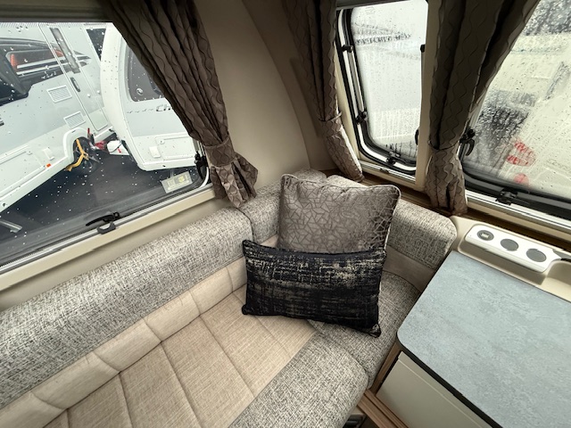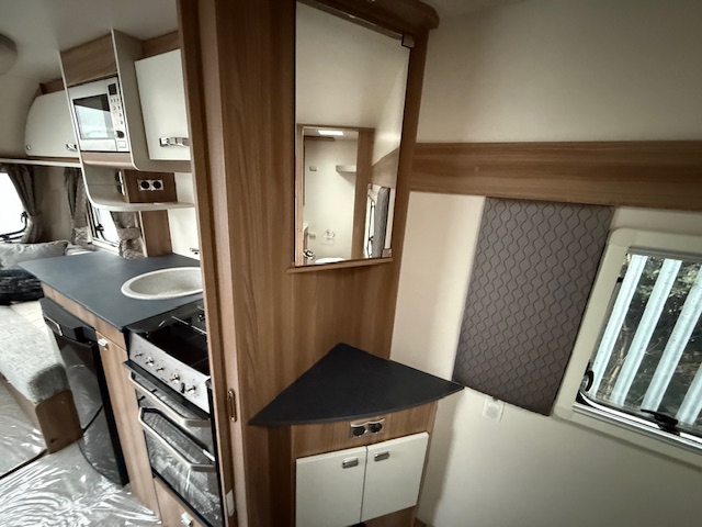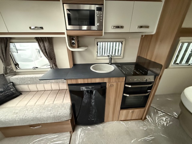 This 4 berth touring caravan has a seating area at the front. The slats pull out from underneath the front bench enabling you to make the front bed to a double. Behind the sitting area is the kitchen which is well equipped with 3 way fridge, gas hob, gas oven & grill, microwave and lots of storage. To the centre of the caravan island bed, with storage underneath and wardrobes either side with lockers above. To the rear of the caravan is the washroom area which has a Thetford swivel electric flush toilet, separate shower unit, washroom sink and vanity cupboards.