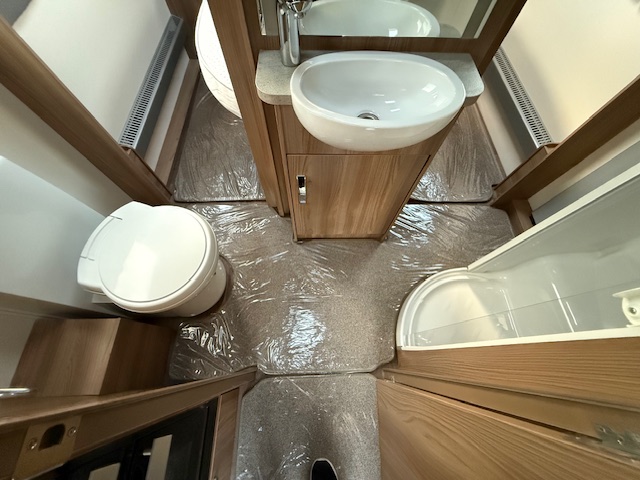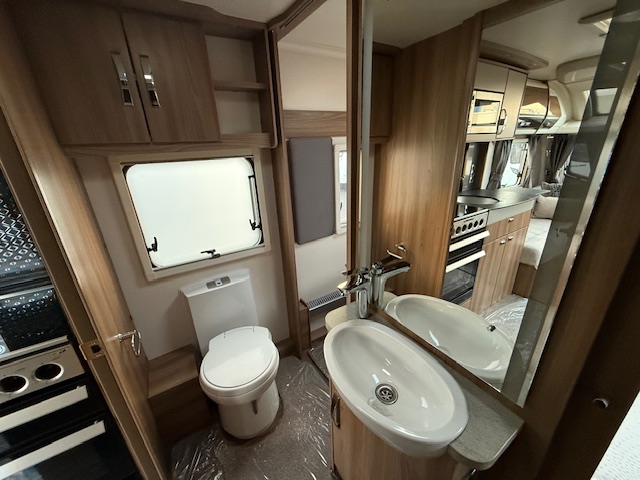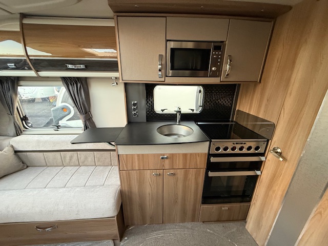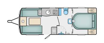 This 4 berth touring caravan has a seating area at the front. The slats pull out from underneath the front chest enabling you to make the front bed or the seats are long enough to make into two singles. Behind the sitting area is the kitchen which is well equipped with 3 way fridge, dual fuel hob, gas oven & grill, microwave and lots of storage. To the centre of the caravan is the washroom area which has a Thetford swivel electric flush toilet, separate shower unit, washroom sink and vanity cupboards. To the rear is the fixed transverse island bed with wardrobes either side, vanity area & storage underneath.