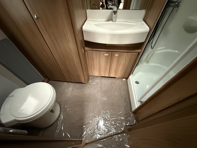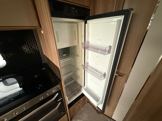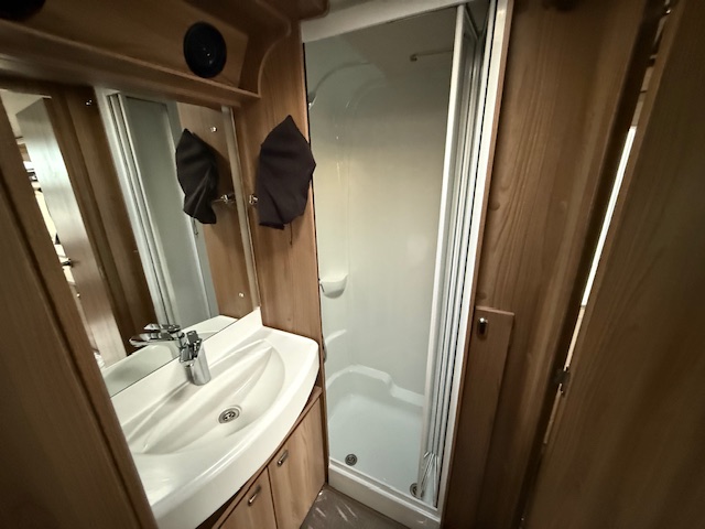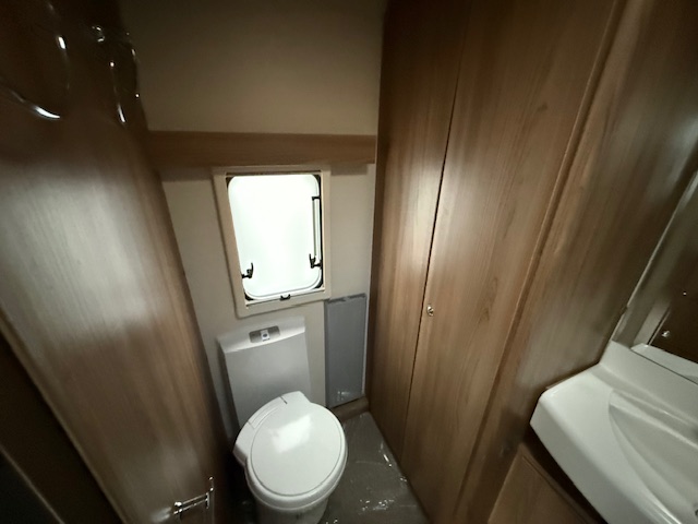 This 2 berth touring caravan has a seating area at the front. The slats pull out from underneath the front chest enabling you to make the front bed or the seats are long enough to make into two singles. Behind the sitting area is the kitchen which is well equipped with 3 way fridge, dual fuel hob, gas oven & grill, microwave and lots of storage. To the rear of the caravan is the washroom area which has a Thetford swivel electric flush toilet, separate shower unit, washroom sink and vanity cupboards.