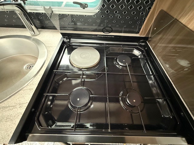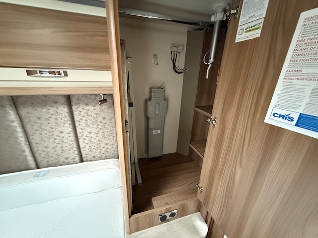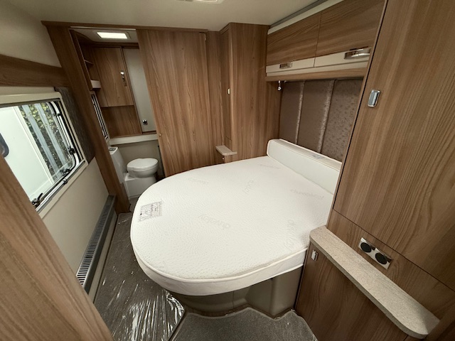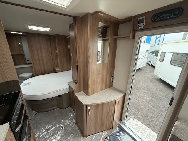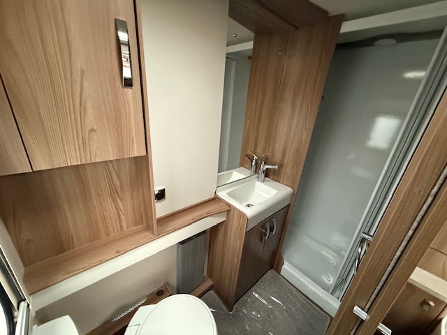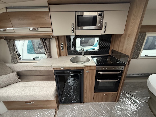 This 4 berth touring caravan has a seating area at the front. The slats pull out from underneath the front bench enabling you to make the front bed to a double. Behind the sitting area is the kitchen which is well equipped with 3 way fridge, gas hob, gas oven & grill, microwave and lots of storage. To the centre of the caravan island bed, with storage underneath and wardrobes either side with lockers above. To thte rear of the caravan is the washroom area which has a Thetford swivel electric flush toilet, separate shower unit, washroom sink and vanity cupboards.