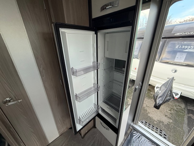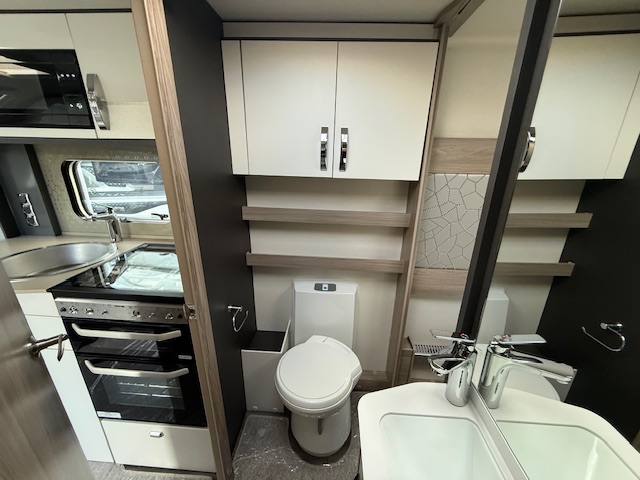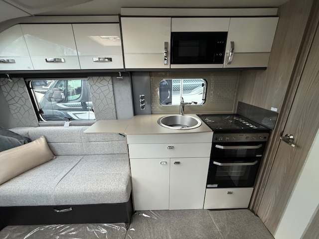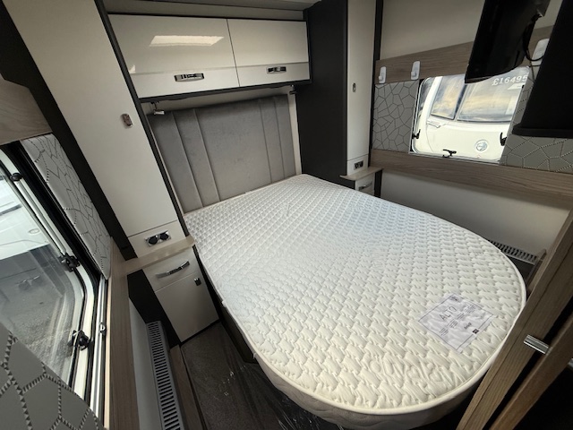 This 4 berth touring caravan has a seating area at the front. The slats pull out from underneath the front chest enabling you to make the front bed or the seats are long enough to make into two singles. Behind the sitting area is the kitchen which is well equipped with 3 way fridge, dual fuel hob, gas oven & grill, microwave and lots of storage. To the centre of the caravan is the washroom area which has a Thetford swivel electric flush toilet, separate shower unit, washroom sink and vanity cupboards. To the rear is the fixed island bed with wardrobes either side, & storage underneath.