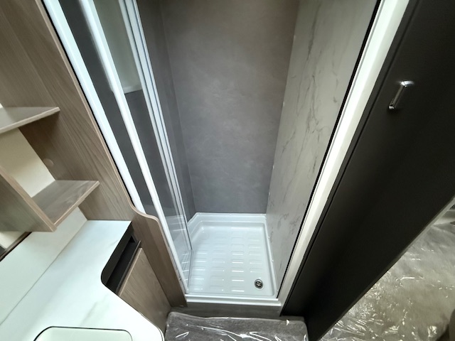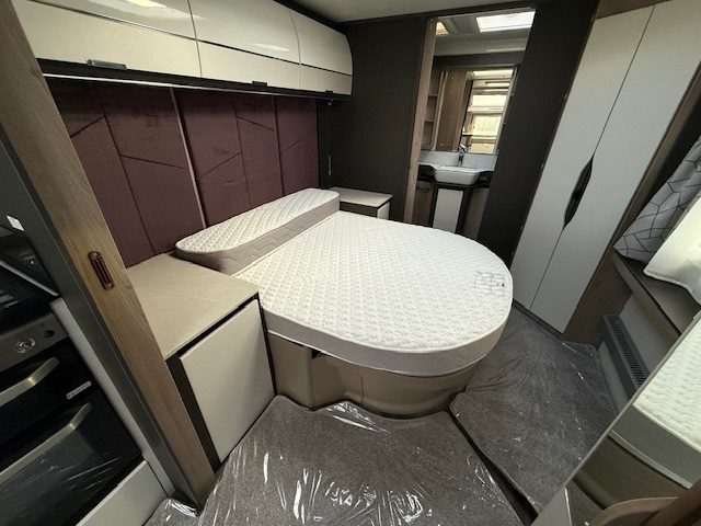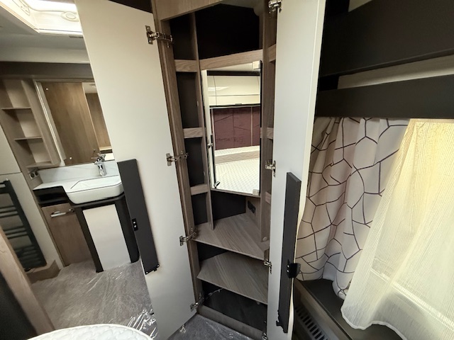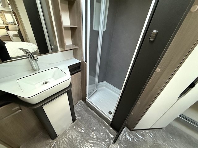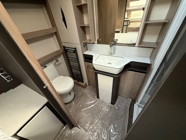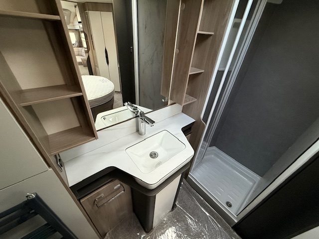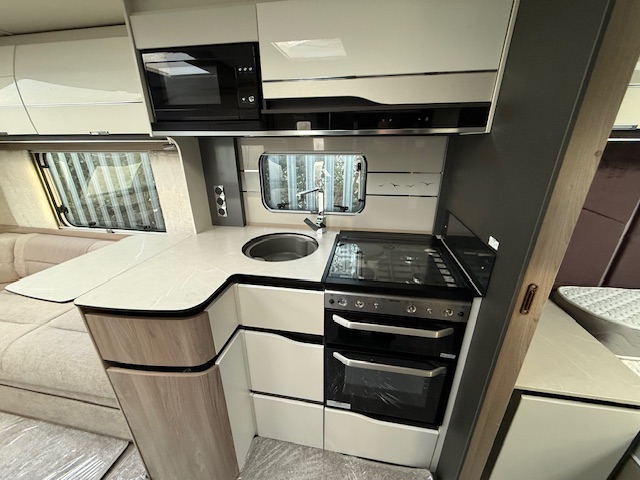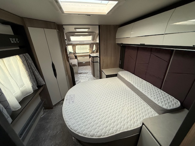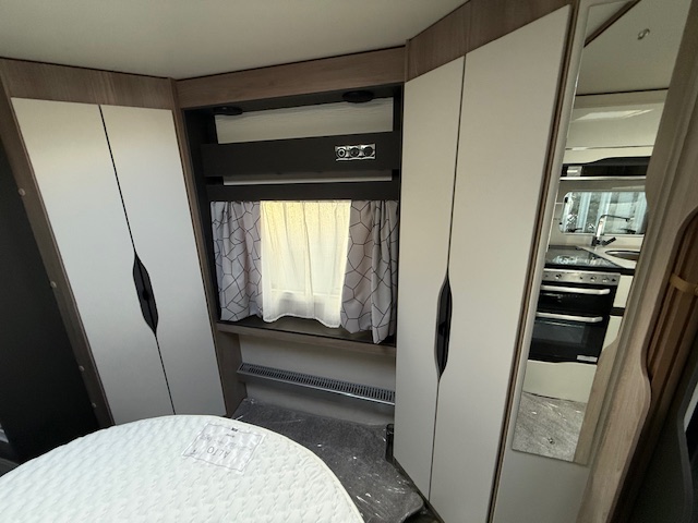This 4 berth touring caravan has a seating area at the front. The slats pull out from underneath the front chest enabling you to make the front bed or the seats are long enough to make into two singles. Behind the sitting area is the kitchen which is well equipped with 3 way fridge, dual fuel hob, gas oven & grill, microwave and lots of storage. To the centre of the caravan is the fixed transverse island bed with wardrobes either side, vanity area & storage underneath. To the rear is the washroom area which has a Thetford swivel electric flush toilet, separate shower unit, washroom sink and vanity cupboards.
