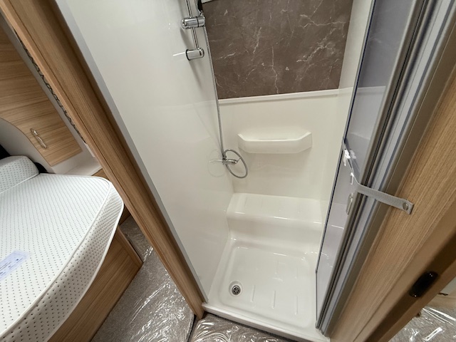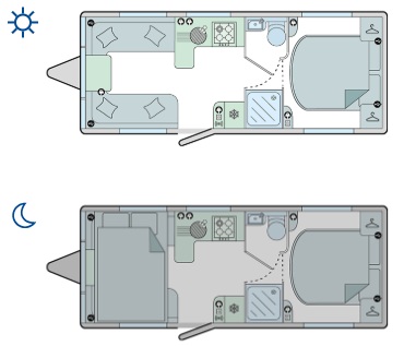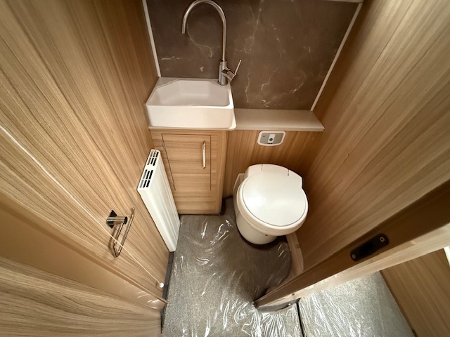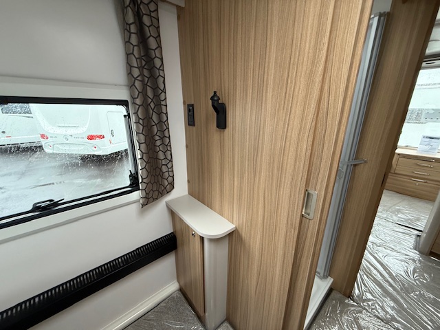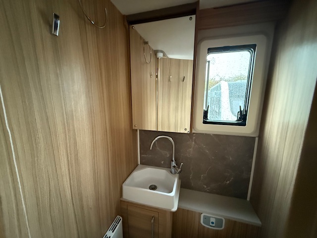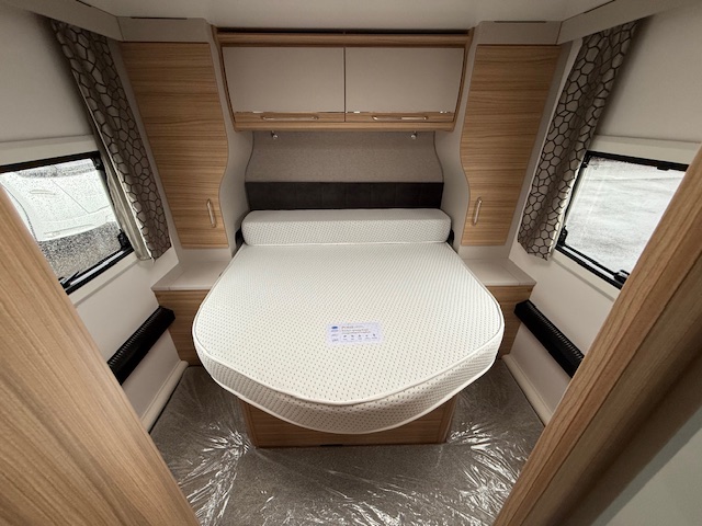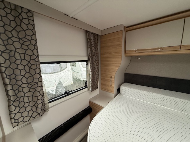 This 4 berth touring caravan has a seating area to the front made up of two lounge seats which convert in to a double bed by pulling the two bases together. There is a front centre chest of drawers and lockers over each lounge seats. Behind the seating area is the l-shaped kitchen with plenty of worktop space, tall fridge, oven and grill with three burner hob and hot plate. The kitchen is fitted with microwave and ample storage. The habitation door is a stable door style fitted with bin, flyscreen and blind. There is LED lighting throughout the caravan. To the centre of the caravan is the washroom which is fitted with floating sink, radiator, Thetford swivel toilet with electric pump, separate shower cubicle with eco-camel shower head for water saving high powered showers. To the rear of the caravan is the fixed island bed with wardrobes either side, lockers above the bed and storage below, TV Media point with provisions for TV Bracket and vanity area.
