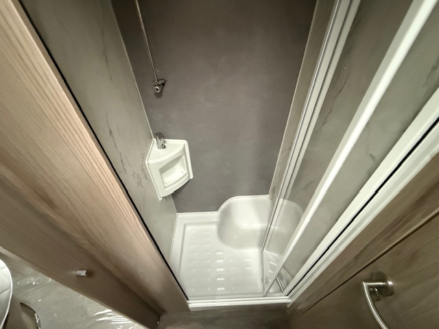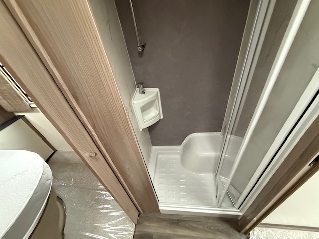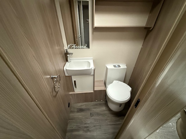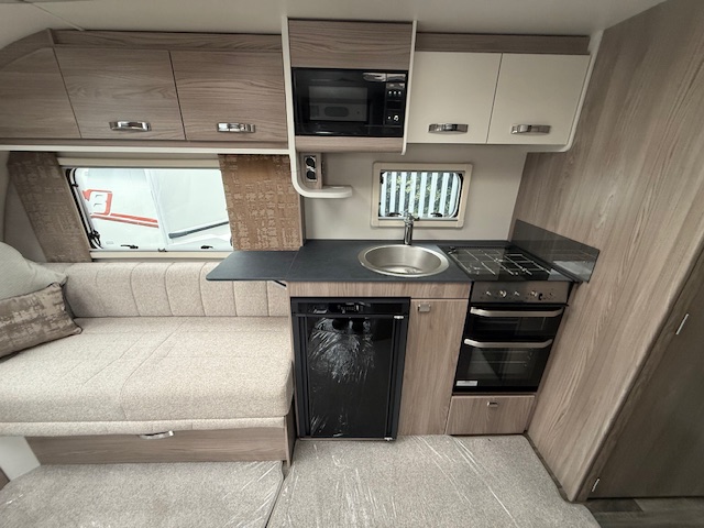 This 4 berth touring caravan has a seating area to the front which also converts into a double bed. With centre chest of drawers, overhead lockers and under seat storage. Behind the sitting area is the kitchen which is well equipped with Dometic 3 way fridge with freezer compartment, Thetford gas oven with grill fitted with a 3 burner hob, flat bed microwave and lots of storage. Behind the kitchen area is the washroom which is equipped with Thetford swivel electric flush toilet, vanity storage lockers, separate shower with Ecocamel water saving shower head. To the rear of the caravan is the fixed island bed that has wardrobes eitherside and storage underneath. There is also a TV point opposite the bed with mounting point.