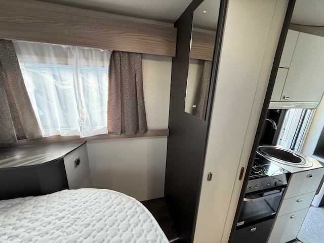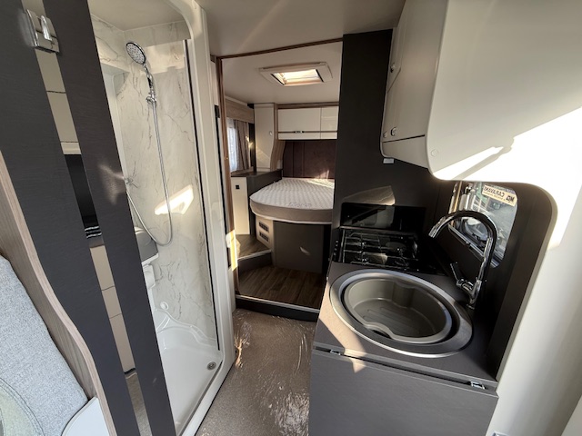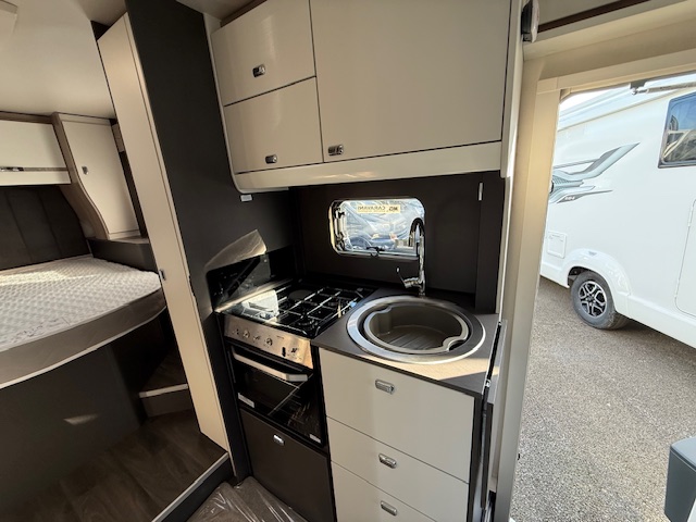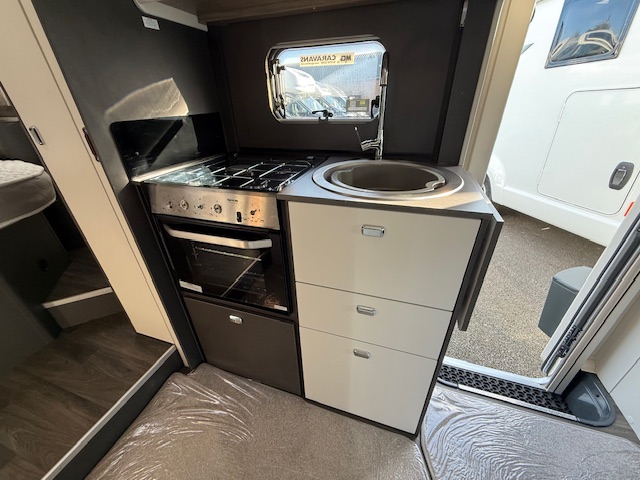 – Thetford Triplex combination oven and grill, plus a three-burner gas hob with electric hotplate, all with electronic ignition. Hob features a glass lid with automatic gas shut-off functionality