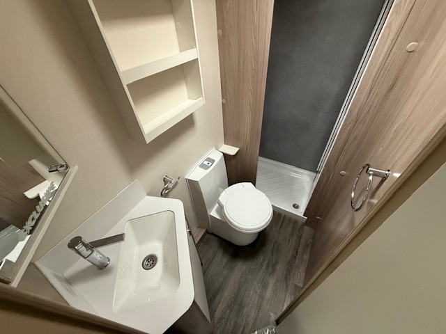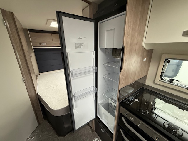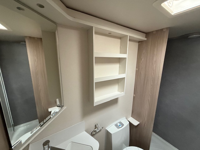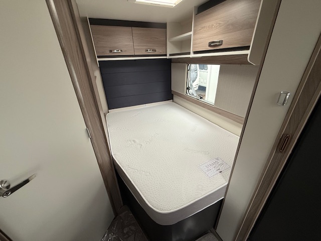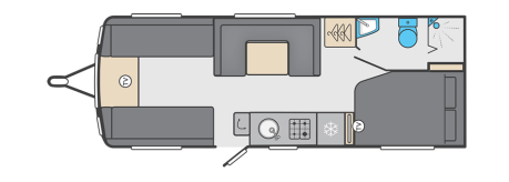 This 6 berth touring caravan has a seating area to the front which also converts into a double bed. With centre chest of drawers, overhead lockers and under seat storage. Behind the sitting area is an additional seating area which converts into a double bed and storage with the kitchen opposite which is well equipped with Dometic 3 way fridge with freezer compartment, Thetford gas oven with grill fitted with a 3 burner hob, flat bed microwave and lots of storage. To the rear of the caravan is the washroom which is equipped with Thetford swivel electric flush toilet, vanity storage lockers, separate shower with Ecocamel water saving shower head. To the side of the washroom is the fixed French style bed with storage underneath.