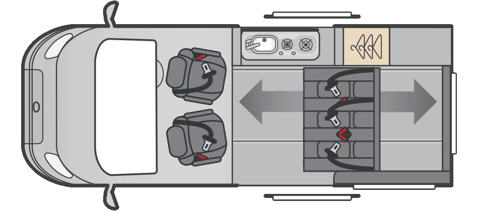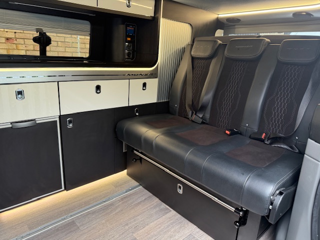 - Rock ‘n’ Roll Reimo Variotech 3000 multi-position rear seat system with three 3-point seatbelts, which converts into double bed (1980mm x 1110mm)