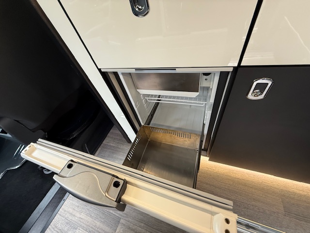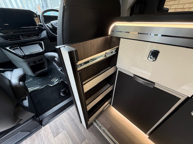 - Curved cabinets, upper lockers and rear cupboard in boot area, all with flush-fitting chrome handles and positive locker catches for secure storage on the move