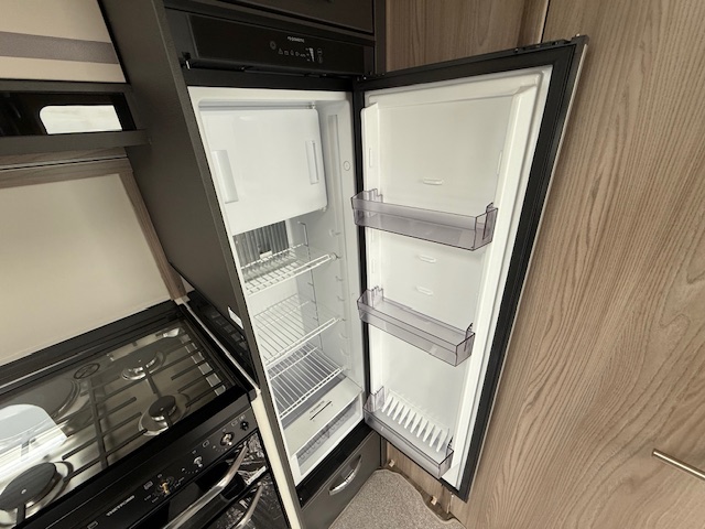 - Dual hinged Dometic (Series 10) 133 litre tall slimline fridge with electronic ignition incorporating 12 litre removable freezer compartment