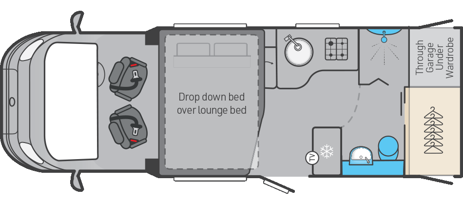 - Spring-assisted lounge seats and bed tops for easy storage access (except travelling seats)