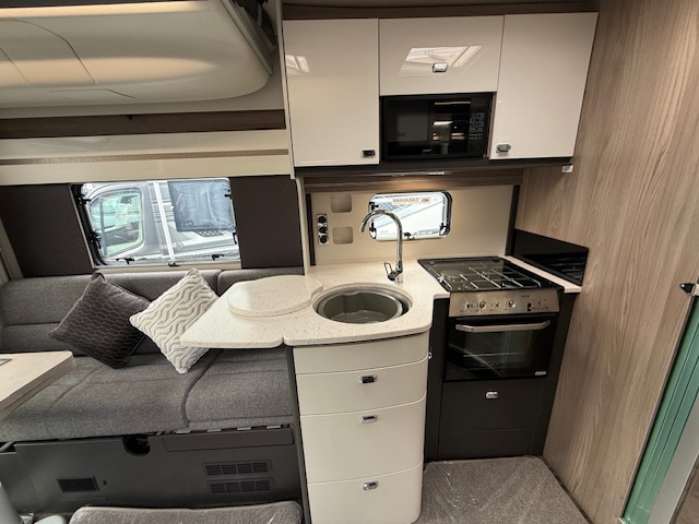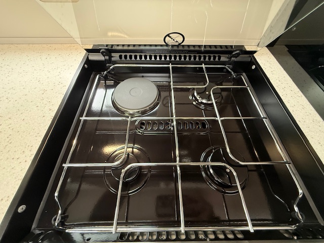 - Thetford Triplex combination oven and grill, plus a three-burner gas hob with electric hotplate, all with electronic ignition. Hob features a glass lid with automatic gas shut-off functionality