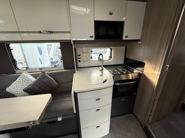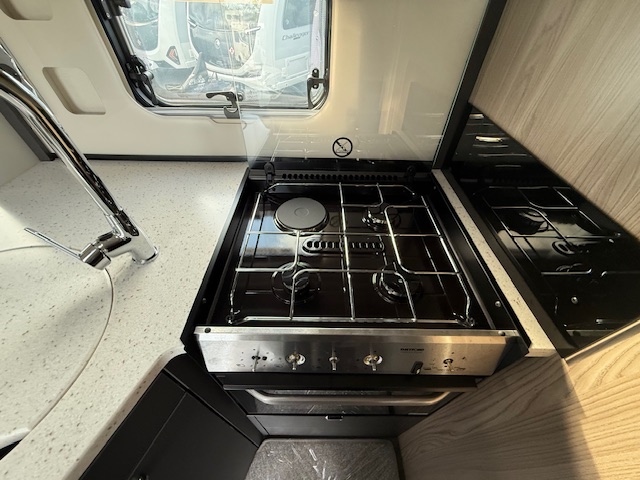 - Thetford Triplex combination oven and grill, plus a three-burner gas hob with electric hotplate, all with electronic ignition. Hob features a glass lid with automatic gas shut-off functionality