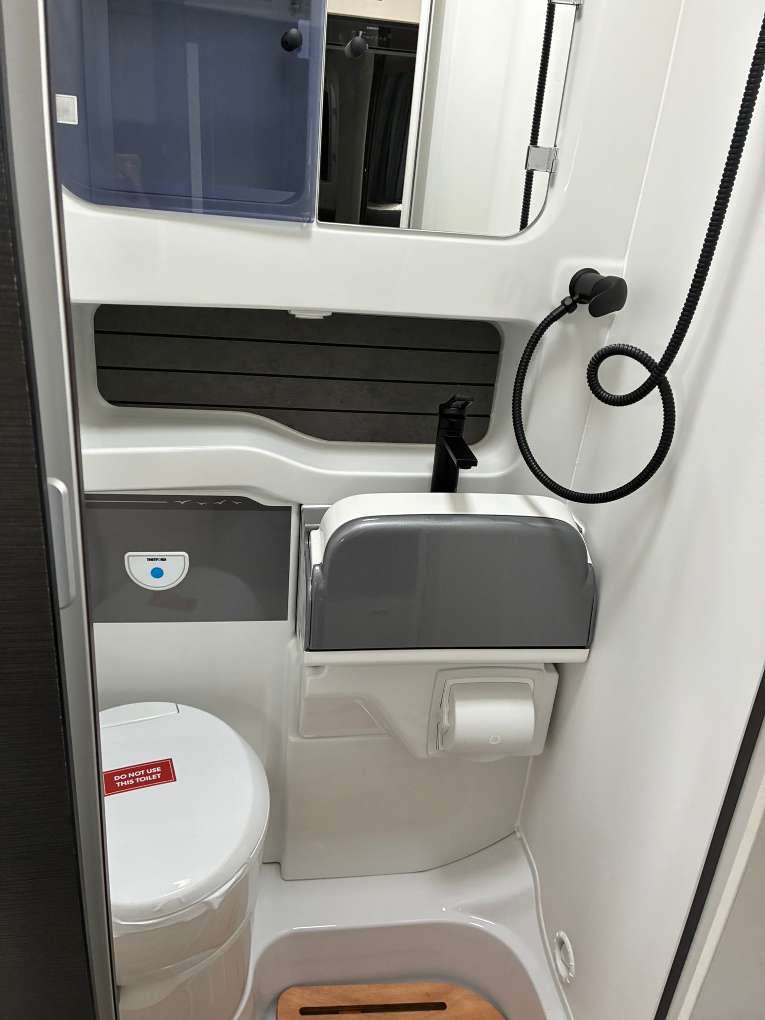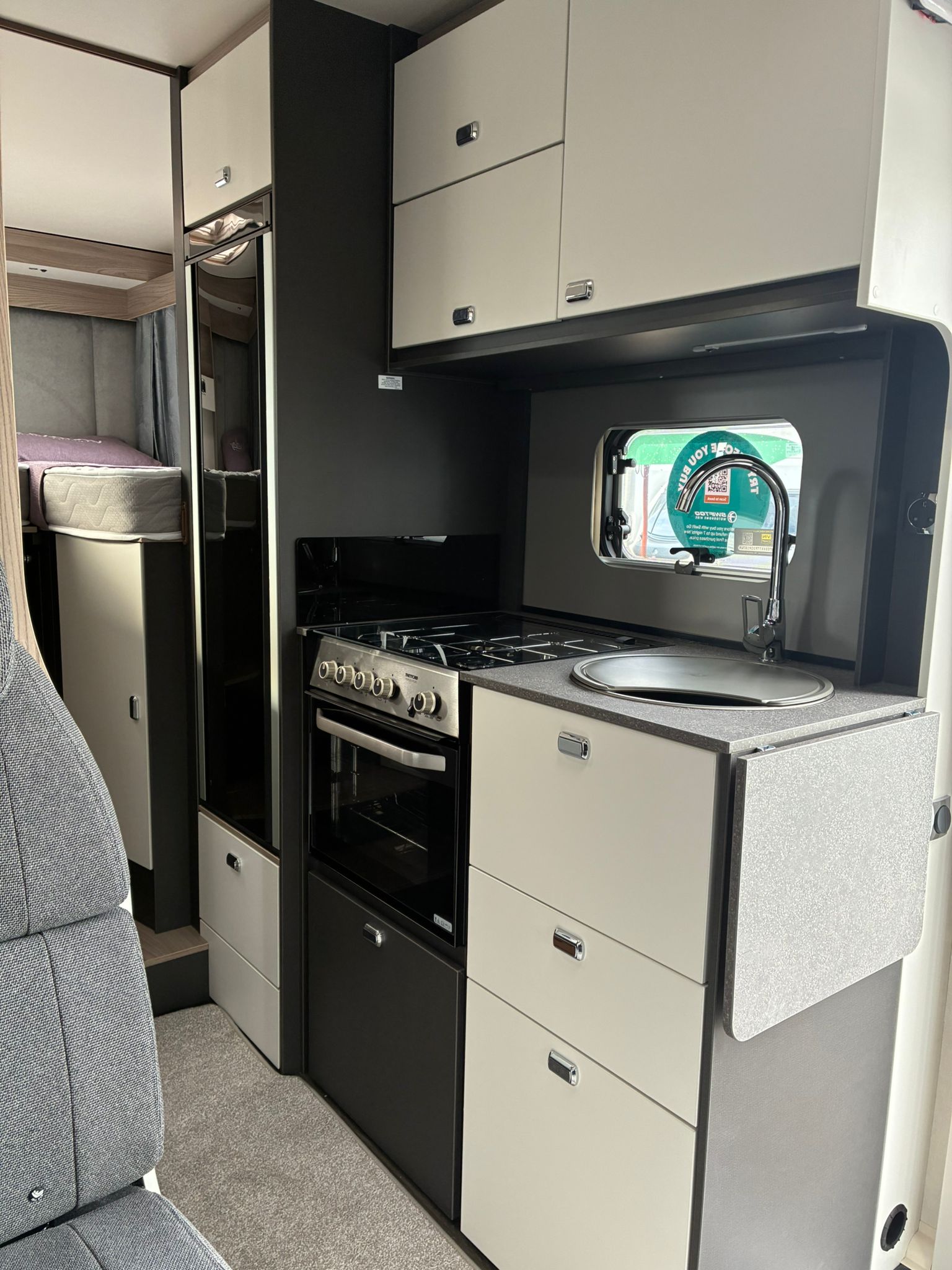 – Thetford Triplex combination oven and grill, plus a three-burner gas hob with electric hotplate, all with electronic ignition. Hob features a glass lid with automatic gas shut-off functionality