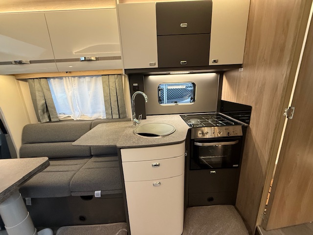 – Thetford Triplex combination oven and grill, plus a three-burner gas hob with electric hotplate, all with electronic ignition. Hob features a glass lid with automatic gas shut-off functionality